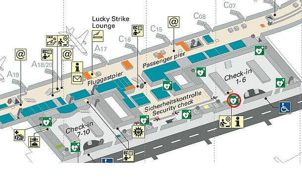 | Beschreibung des AED-Standortes: | Terminal 1 = Ebene 1, gegenüber CheckIn 1 und Information |