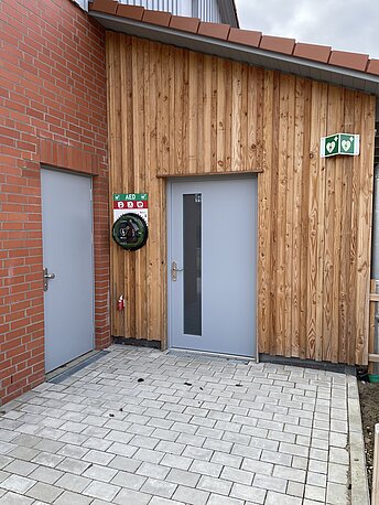 | Beschreibung des AED-Standortes: | Außenbereich, Holzbekleideter Eingangsbereich an der Seite des Gebäudes, 24h zugänglich. |