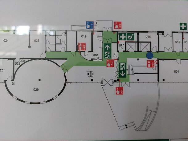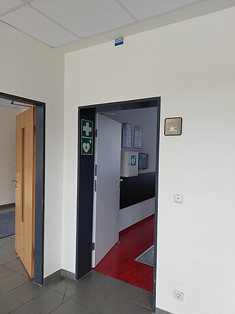 Beschreibung des AED-Standortes: Teeküche Erdgeschoß, zwischen der Pforte und den Fahrstuhl