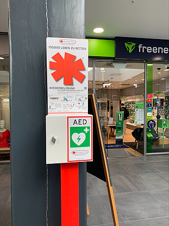 | Beschreibung des AED-Standortes: | EG, Säule vor dem Freenet Shop |
