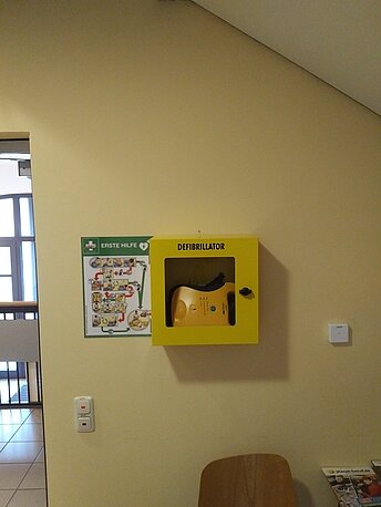 | Beschreibung des AED-Standortes: | Nebengebäude, 1. OG, linke Seite unter der Treppe |