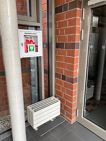 | Beschreibung des AED-Standortes: | Erdgeschoss Eingangsbereich Leitstelle | Klingel vor dem Eingansbereich |