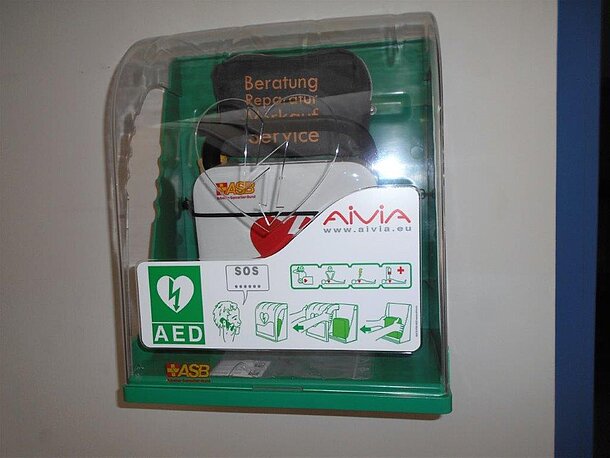 | Beschreibung des AED-Standortes: | Haupteingang, Eingangsbereich rechts an der Wand, Links neben der Eingangstür zur Kinderkrippe |