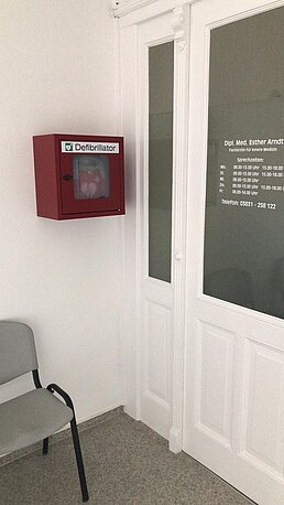 | Beschreibung des AED-Standortes: | 1. OG im Vorraum der Praxen |