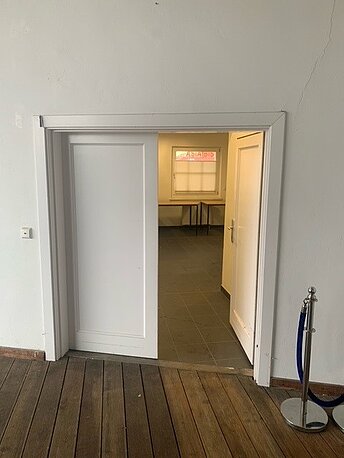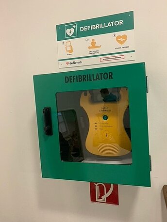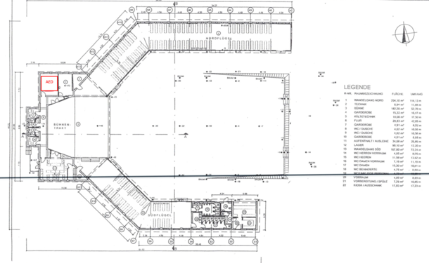 | Beschreibung des AED-Standortes: | Raum hinter der Bühne |