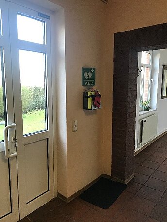 | Beschreibung des AED-Standortes: | Im Flur links neben dem Haupteingang an der Wand |