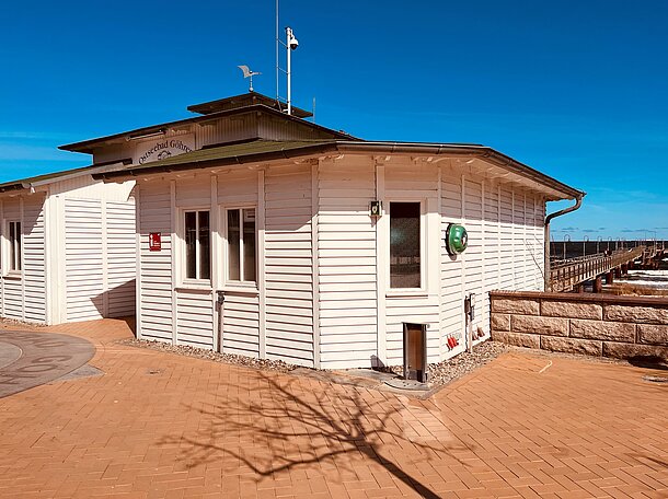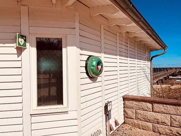 | Beschreibung des AED-Standortes: | Das Gerät ist direkt am Seebrückenhaus installiert und mit einem Hinweisschild versehen. |