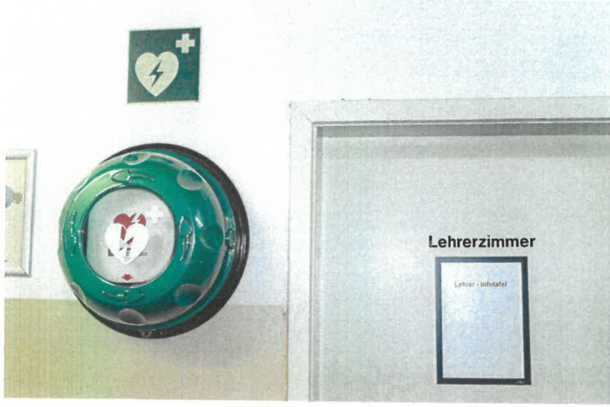 | Beschreibung des AED-Standortes: | Eingang - geradeaus zum Lehrerzimmer - an der Wand |