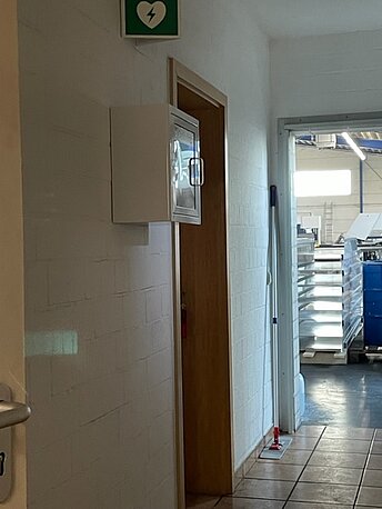 | Beschreibung des AED-Standortes: | Erdgeschoss zwischen Empfangstresen und Werkstatt |