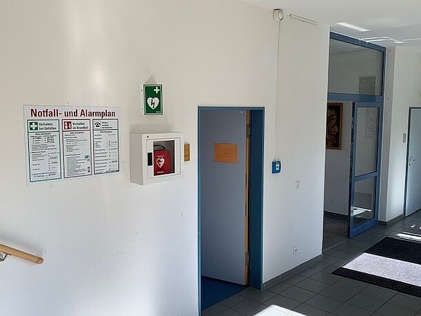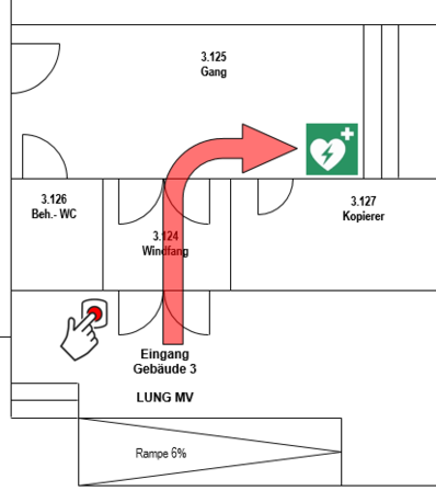 | Beschreibung des AED-Standortes: | Gebäude 3, EG, Flur nahe Haupteingang, Klingel außen |