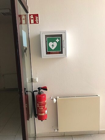 | Beschreibung des AED-Standortes: | Erdgeschoss; Aufgang zur Treppe |