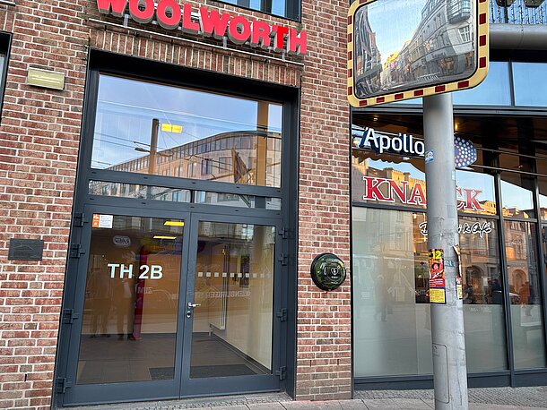 | Beschreibung des AED-Standortes: | Außen zwischen Woolworth und Bäckerei Knaack Rechts neben Glastür TH 2B |